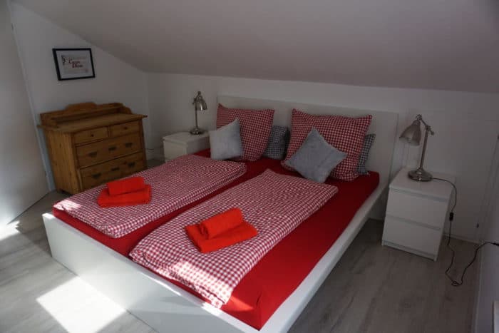 Im ersten Stock geht es genauso stilvoll und geräumig weiter, wie in den anderen beiden Etagen. Oben gibt es ein super großes Bad mit Dusche, ein kleines Kinderspielzimmer (mit Schräge), in dem nochmal zwei Matratzen sind. Außerdem ein kleiner Tisch, Stühlchen, Malsachen, Spiele und und und. Ein weiteres Schlafzimmer gibt es oben auch, mit Doppel und Einzelbett. Wir haben also die 4 Doppelzimmer perfekt genutzt und trotz der fünf Kids und unterschiedlichen Schlafzeiten für Mittagsschläfchen sowie verschiedenen Einschlaf- und Aufwachzeiten am Abend und Morgen, entspannt und erholsam geschlafen. So ist das Schwarzwald Ferienhaus mit Kindern auch super zu bewohnen.